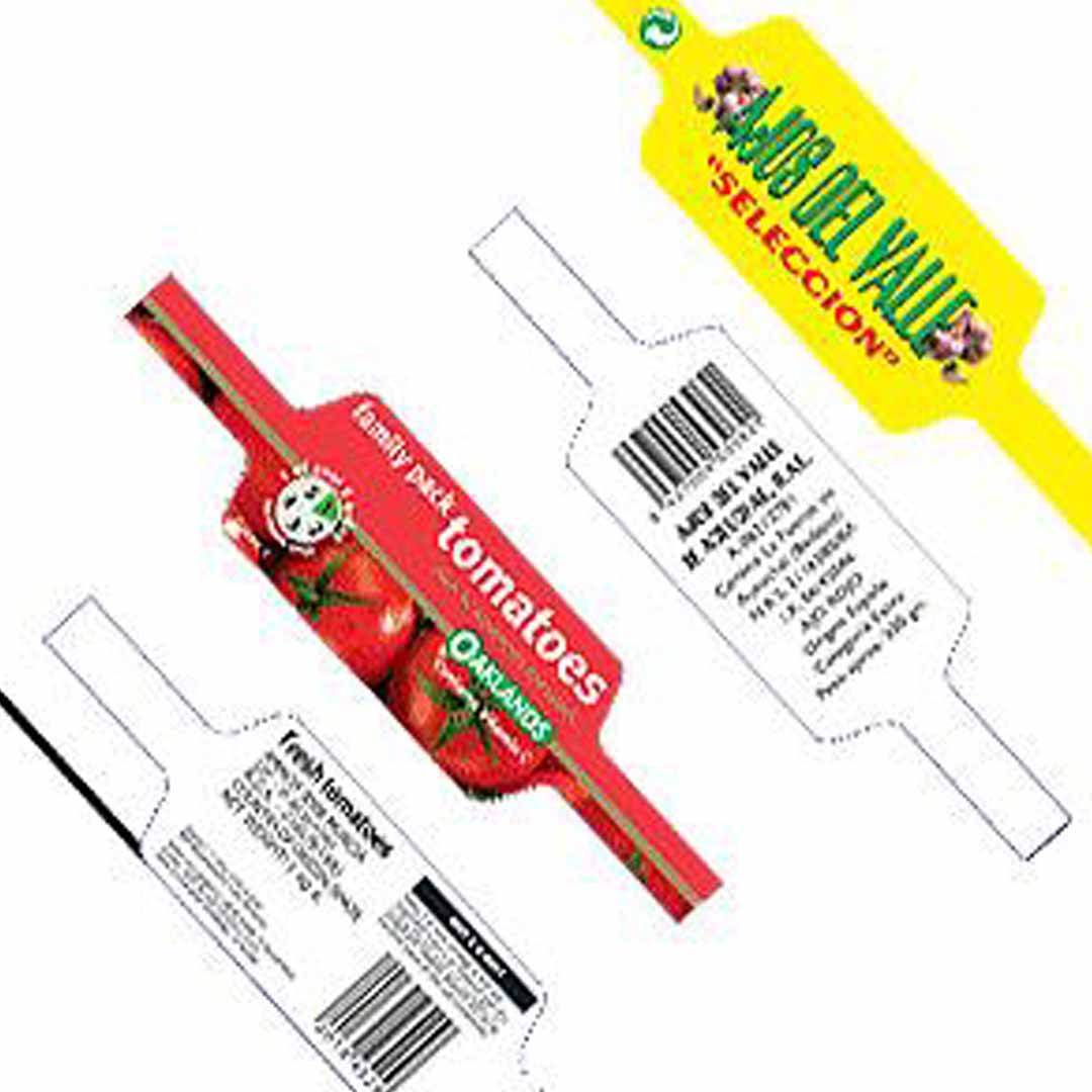 Banda o faja para bandejas de alimentos preparados o frutas , Impreso a cuatro o cinco colores. En material papel o plástico .